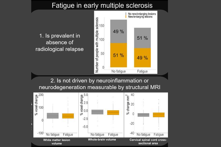 In their study, Dr Rozanna Meijboom and colleagues present findings from the large, longitudinal, multi-centre FutureMS study, led by the Anne Rowling Clinic. Their results show that, in people newly diagnosed with multiple sclerosis, fatigue cannot be readily linked to structural imaging measures of inflammation or neurodegeneration.