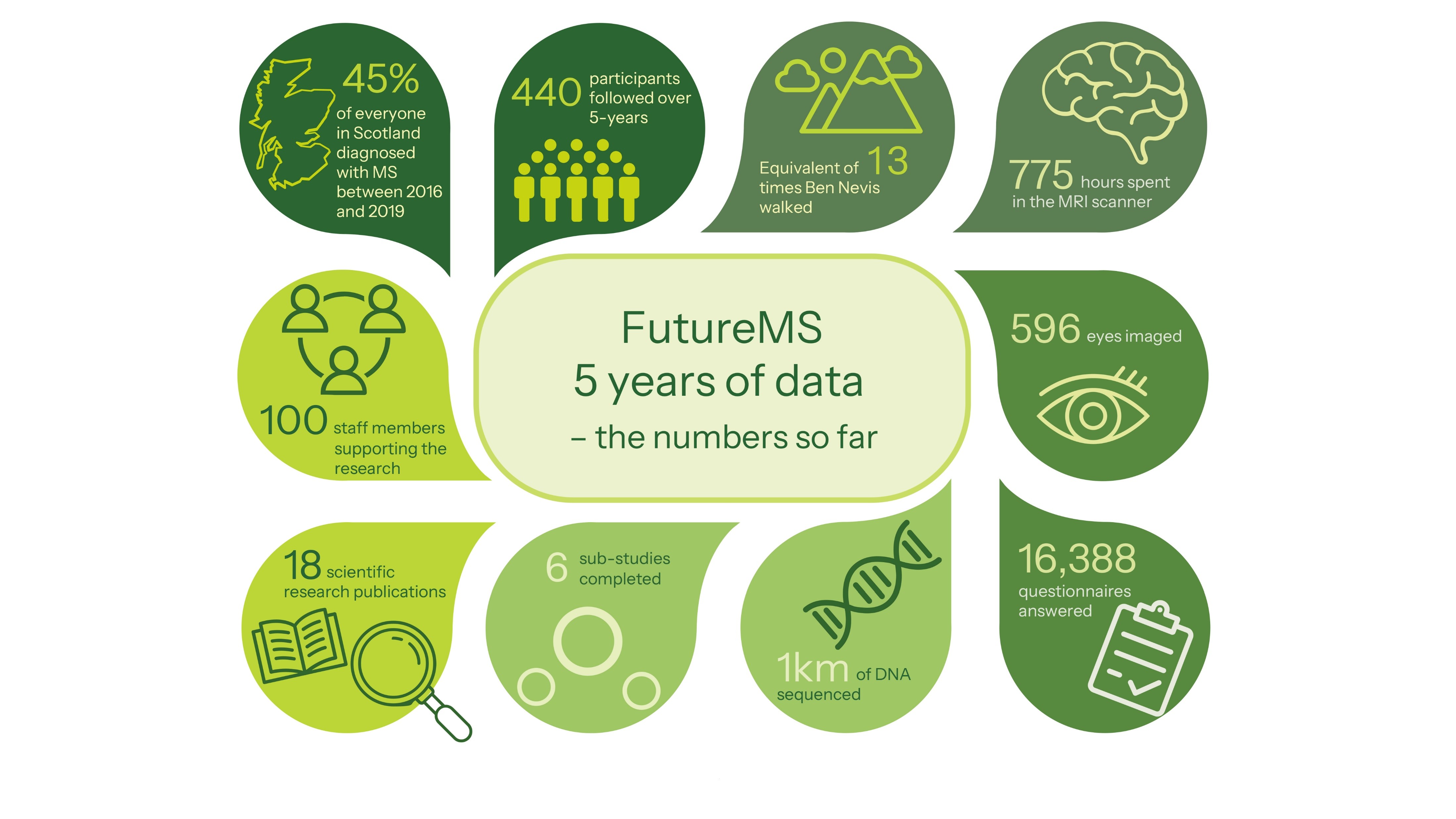 FutureMS is following the MS journeys of 440 people in Scotland who were diagnosed with MS between 2016 and 2019. Participants underwent tests shortly after diagnosis, and again 1 and 5 years later.